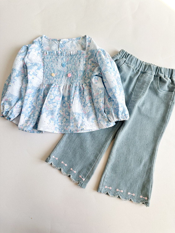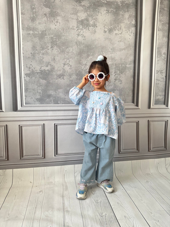 شومیز جذاب و مجلسی آبی و شلوار جین نیم بگ